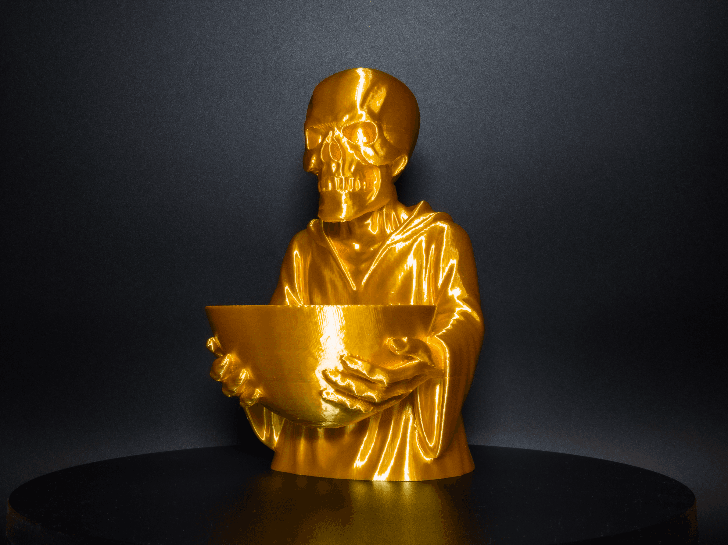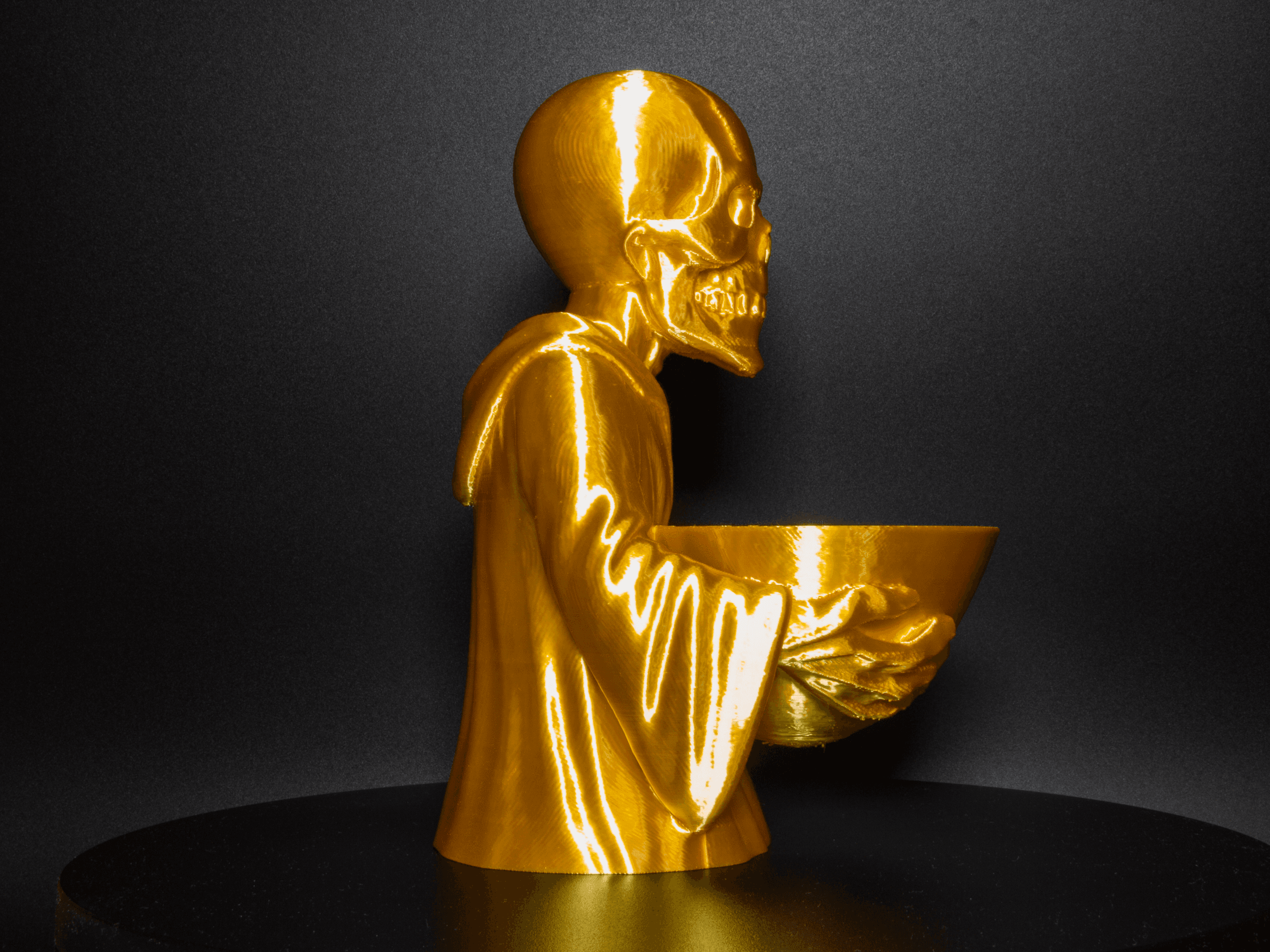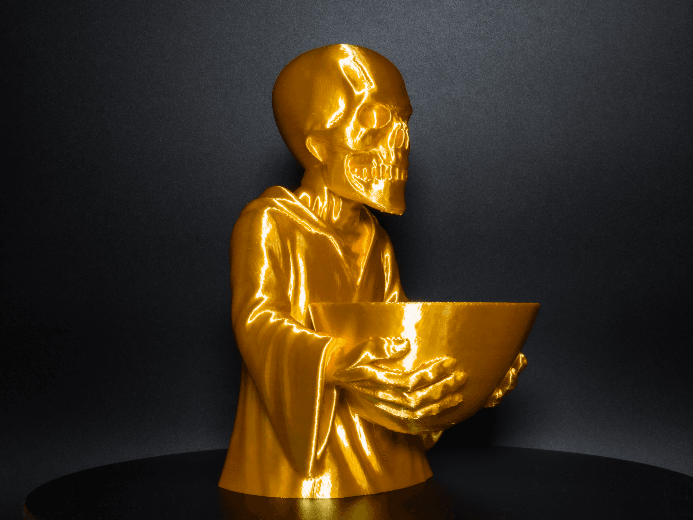 Ассортимент готовых 3D-моделей можно посмотреть здесь, в нашем магазине 3d-opt Shop, в разных вариантах: материала, цвета, размера. Под заказ - по договорённости. Золотая конфетница с элементами скелета – идеальное сочетание и оригинальность! Эта яркая конфетница станет центром внимания благодаря контрастному дизайну: благородный золотой фон дополняется символикой скелета и черепа, создающей эффектной игре света. Подходит как для сервировки десертов, так и для украшения стола – её можно использовать как мини-вазу для фруктов или свежих цветов. Массивная конструкция обеспечивает надёжность даже при частых перестановках. Отличный выбор для тех, кто любит смело экспериментировать с интерьерными решениями. Подарите себе или близким незабываемую находку, сочетающую практичность и экстравагантный вкус!