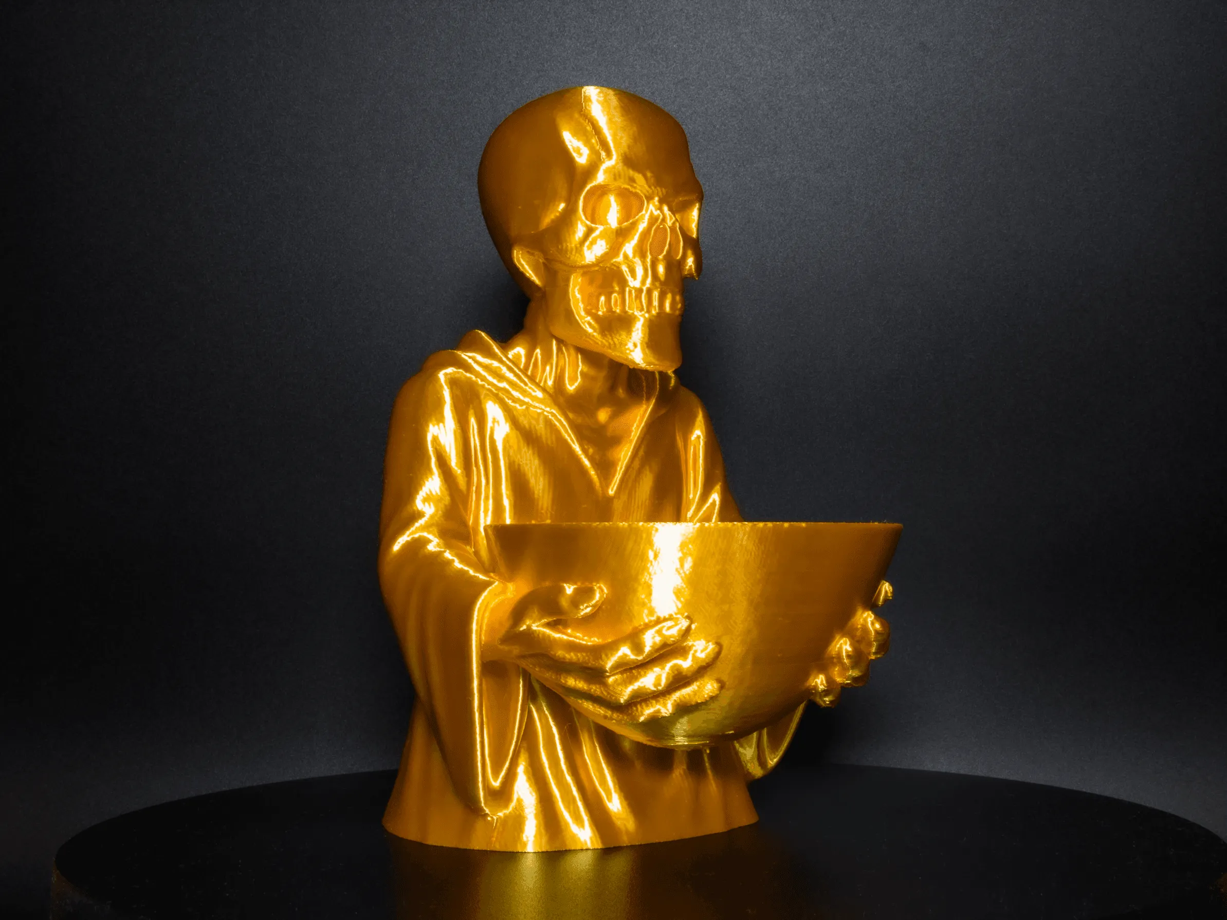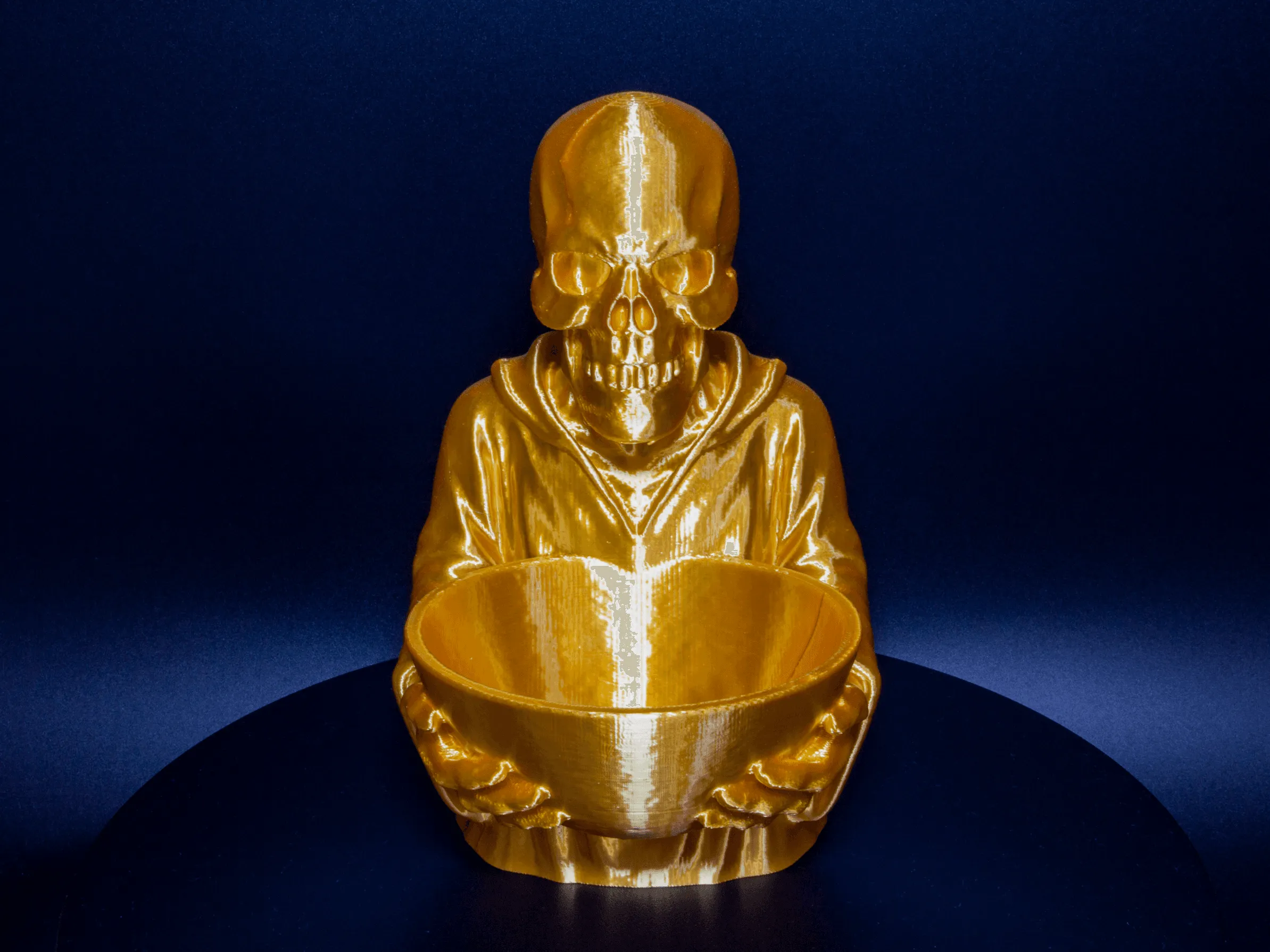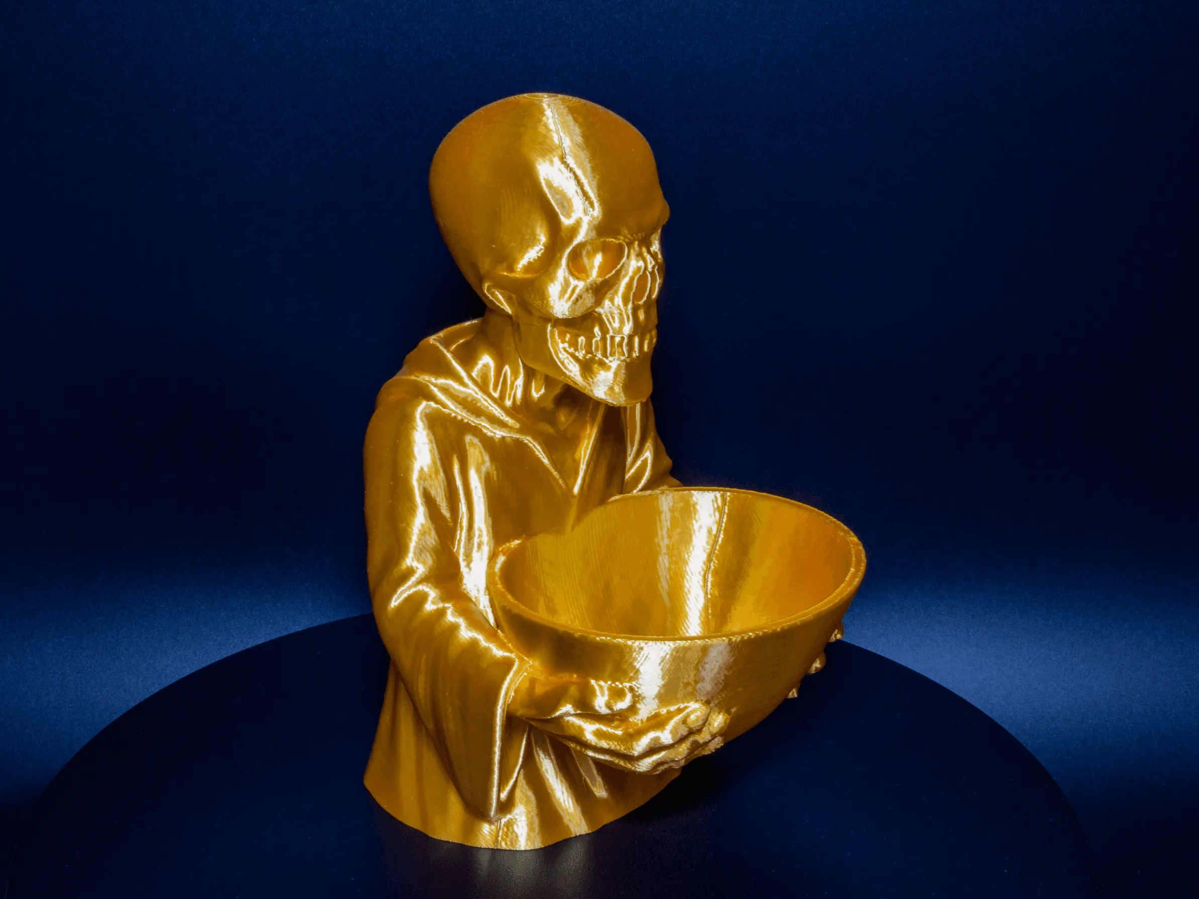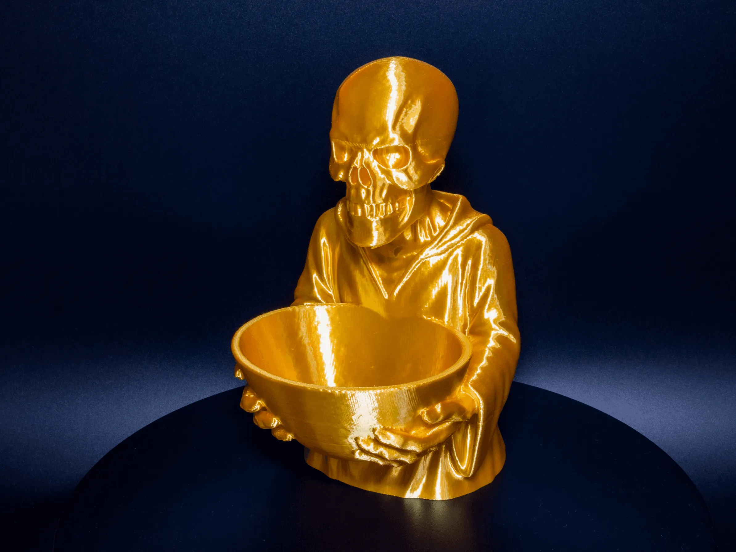 Ассортимент готовых 3D-моделей можно посмотреть здесь, в нашем магазине 3d-opt Shop, в разных вариантах: материала, цвета, размера. Под заказ - по договорённости. Золотая конфетница с элементами скелета – идеальное сочетание и оригинальность! Эта яркая конфетница станет центром внимания благодаря контрастному дизайну: благородный золотой фон дополняется символикой скелета и черепа, создающей эффектной игре света. Подходит как для сервировки десертов, так и для украшения стола – её можно использовать как мини-вазу для фруктов или свежих цветов. Массивная конструкция обеспечивает надёжность даже при частых перестановках. Отличный выбор для тех, кто любит смело экспериментировать с интерьерными решениями. Подарите себе или близким незабываемую находку, сочетающую практичность и экстравагантный вкус!